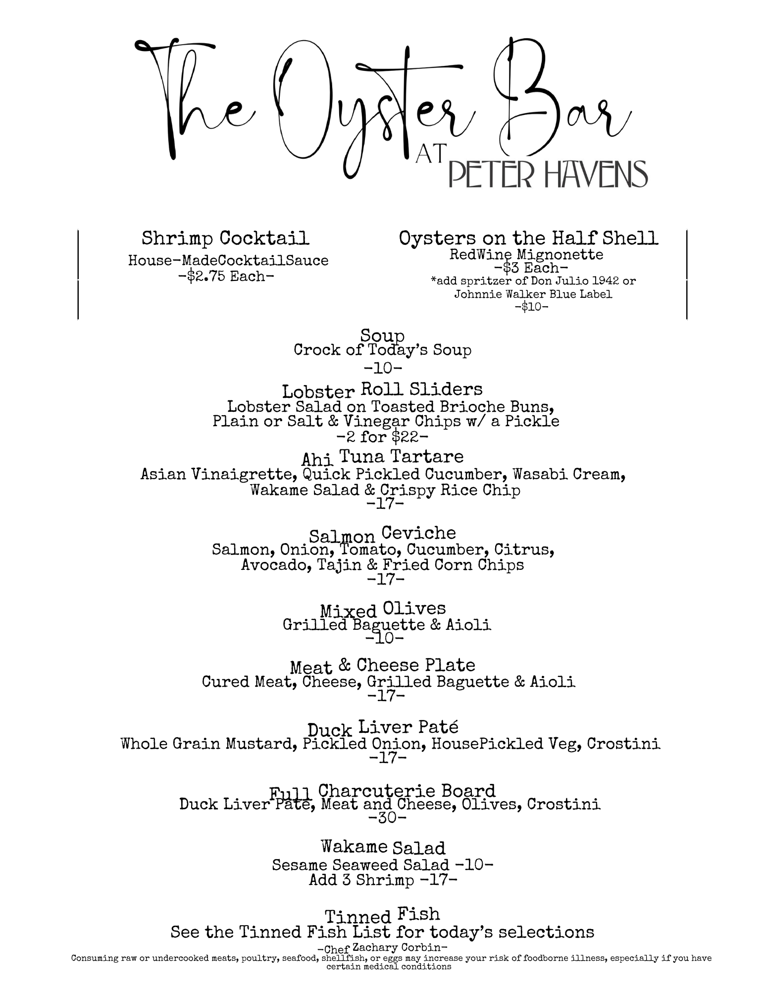 The Oyster Bar serves only small plates and appetizers. If you are looking for a seat at our sister restaurant, Peter Havens, you will need to make a reservation or contact them separately. Please see our home page for more information.